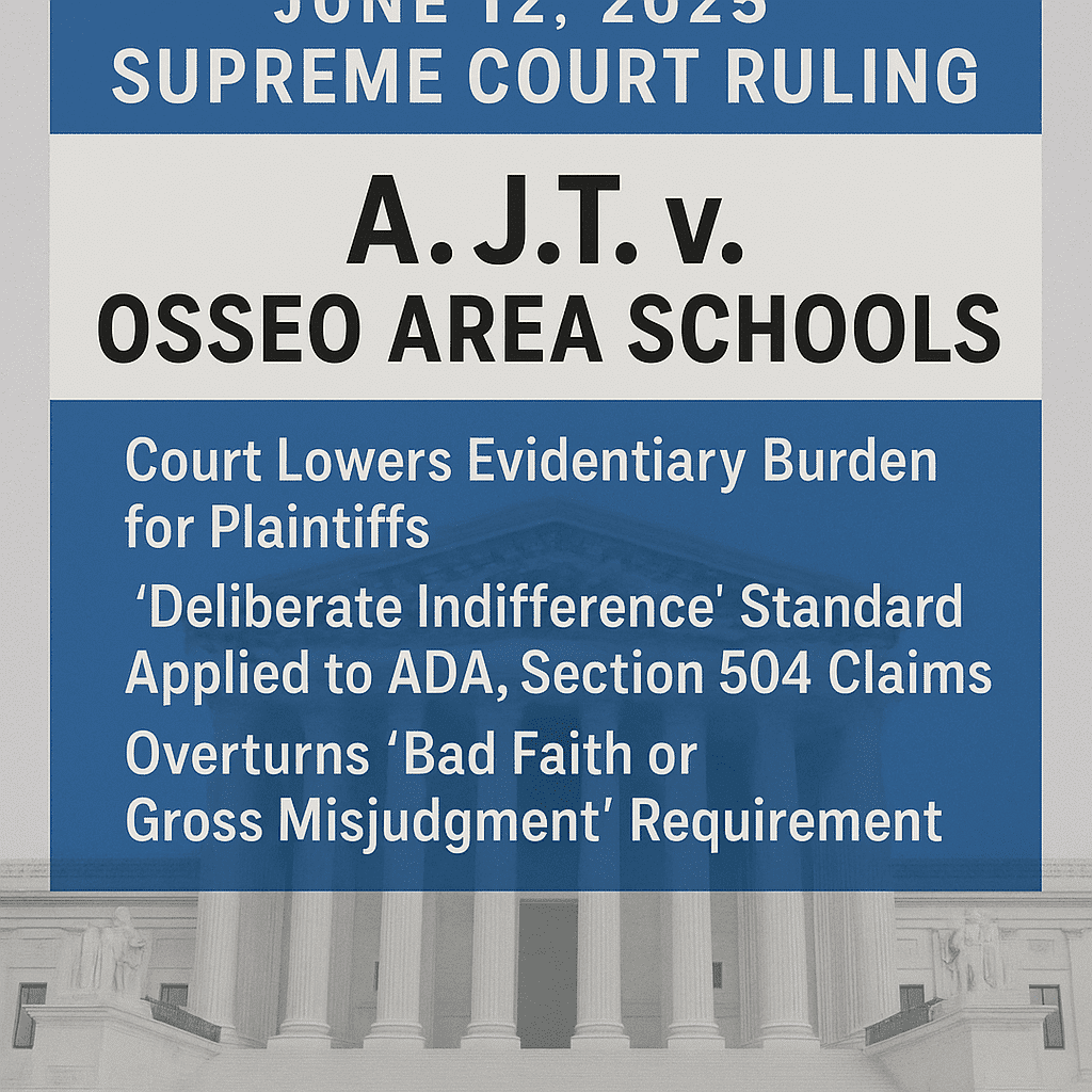 On June 12, 2025, the United States Supreme Court issued a unanimous decision in A.J.T. v. Osseo Area Schools, affirming that students with disabilities denied a Free Appropriate Public Education (FAPE) under the Individuals with Disabilities Education Act (IDEA) may seek compensatory damages under Section 504 of the Rehabilitation Act and the Americans with Disabilities Act (ADA) without having to prove “bad faith” or “gross misjudgment.” This decision clarifies that deliberate indifference is the appropriate standard in such cases, bringing uniformity and clarity to a previously fragmented legal landscape.